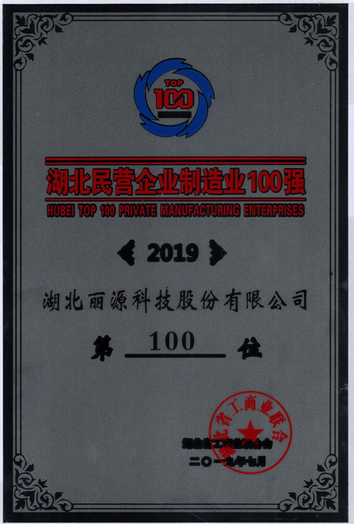 2019年7月,麗源科技入選「湖北民營企業(yè)制造業(yè)100強(qiáng)」