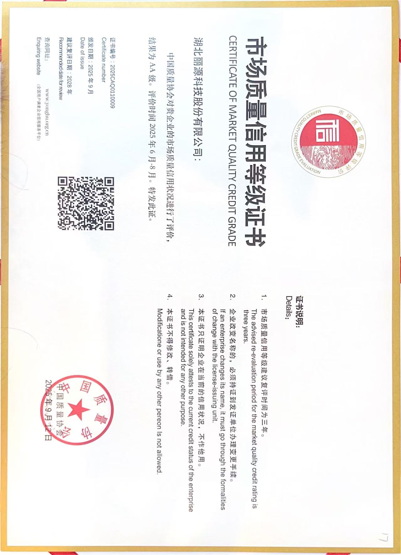 2025年12月,麗源科技被認(rèn)定為「市場質(zhì)量信用AA級企業(yè)」