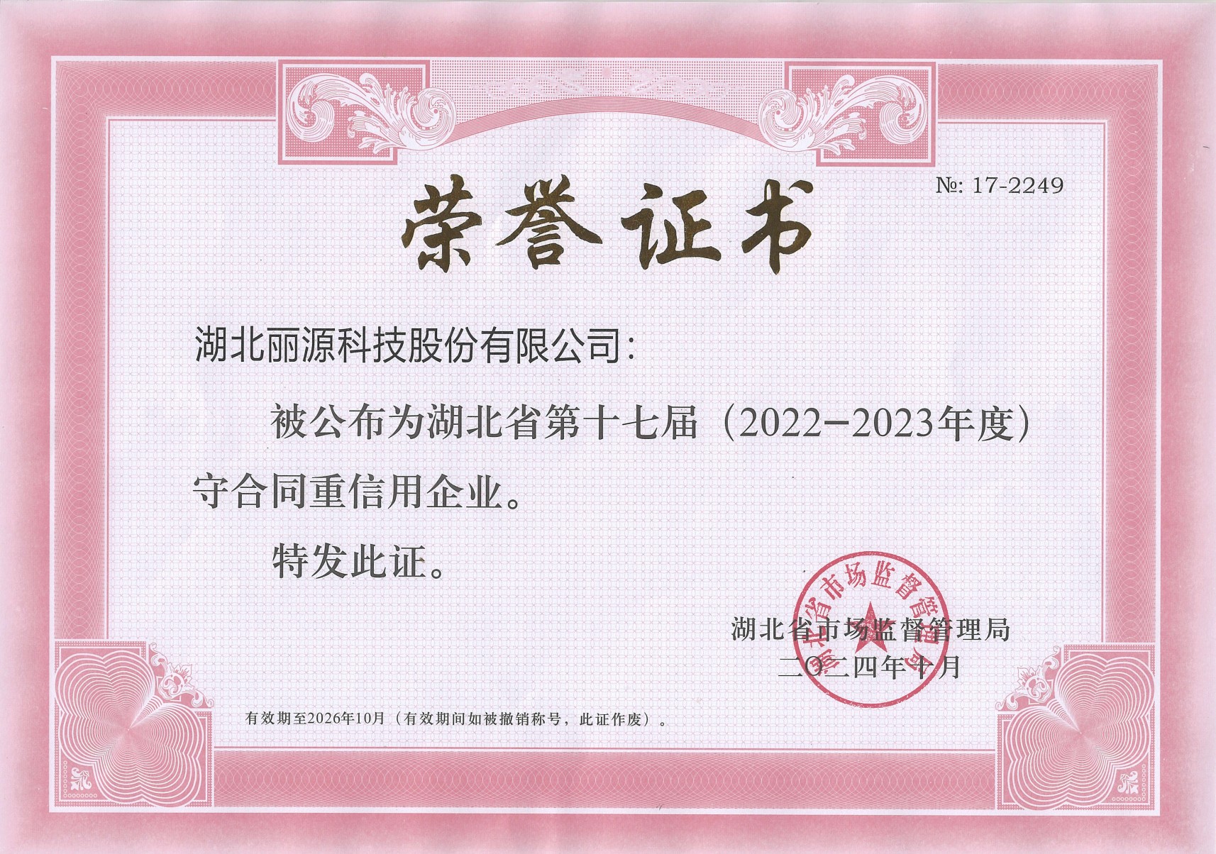 2024年10月,麗源科技被評為「湖北省&荊州市第十七屆守合同重信用企業(yè)」