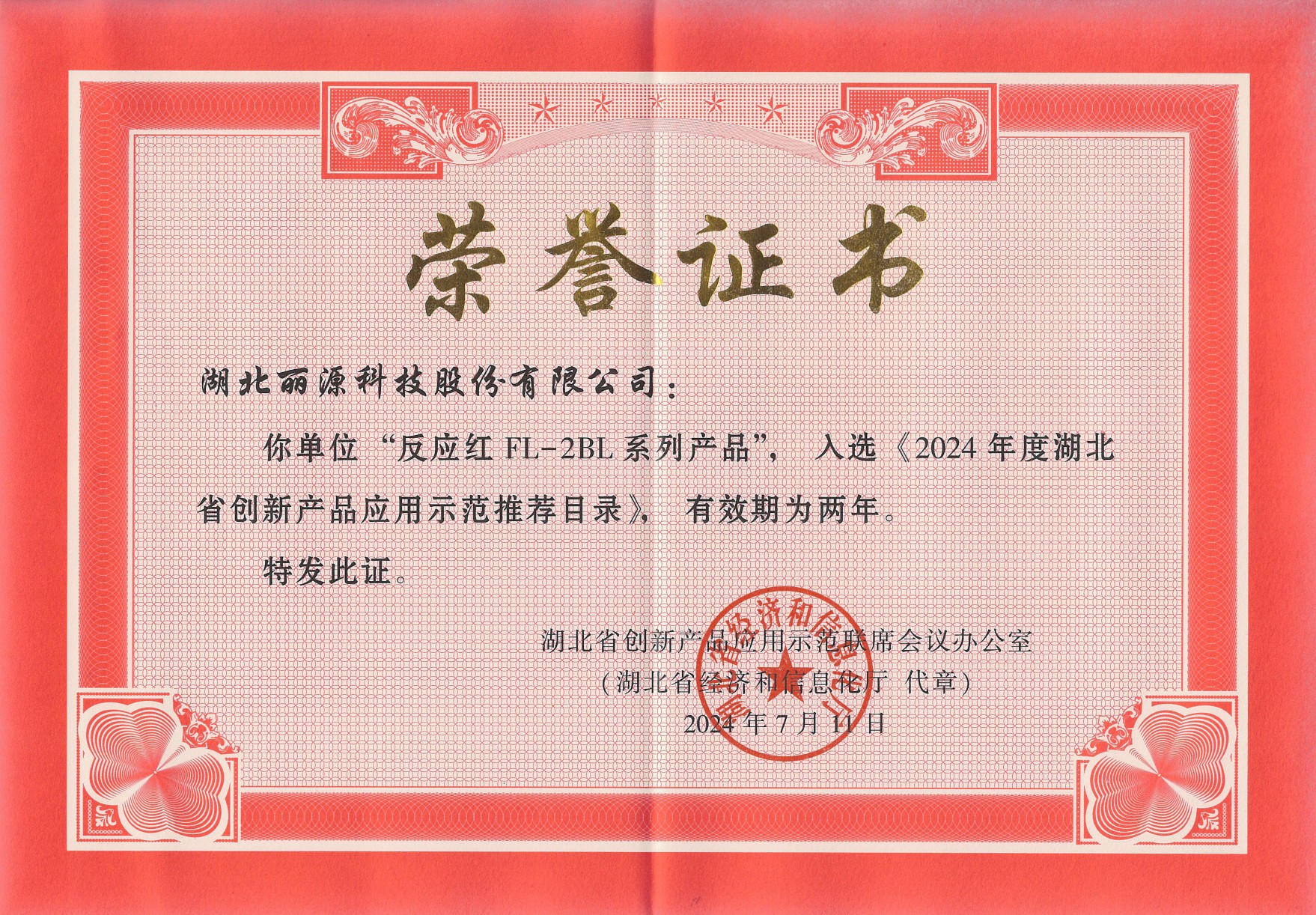 2024年7月,麗源科技反應(yīng)紅FL-2BL系列產(chǎn)品入選「2024年度湖北省創(chuàng)新產(chǎn)品應(yīng)用示范推薦目錄」